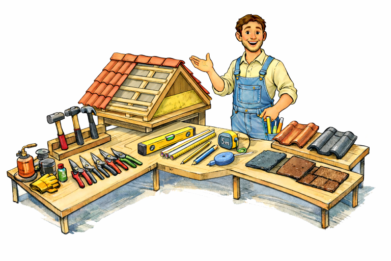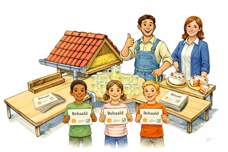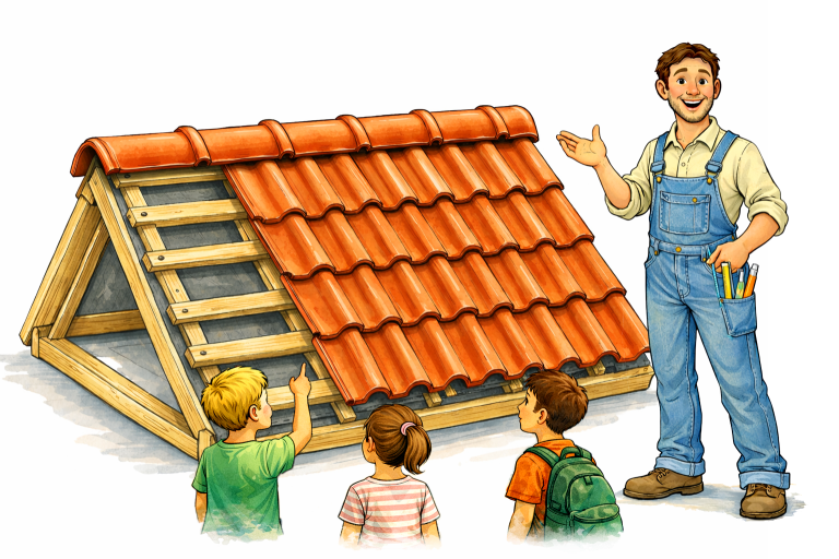 Leerlingen werken samen aan een hellend dakmodel en maken kennis met materialen, gereedschappen en de basisprincipes van dakwerk.